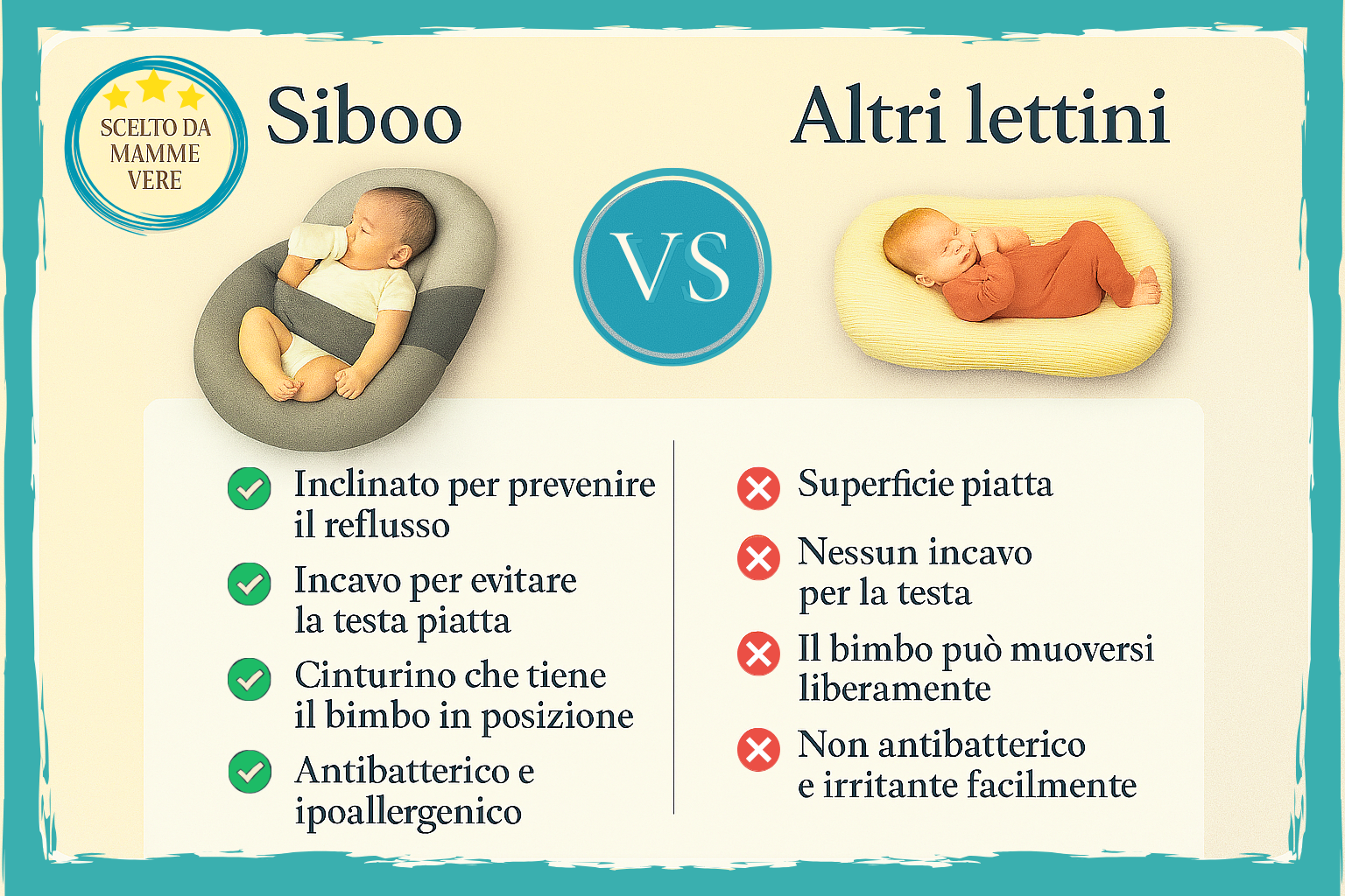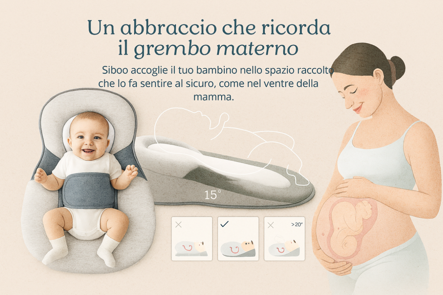 Siboo è pensato per accogliere il bambino in una posizione inclinata e sicura, favorendo il benessere dopo ogni poppata, durante il riposo e durante il gioco.
