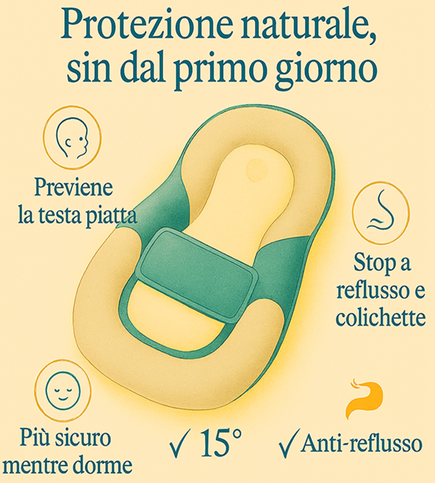 Supporto ergonomico inclinato a 15° che favorisce una postura corretta e un riposo sereno. Essenziale per neonati fino a 12 mesi, aiuta a prevenire fastidi comuni e promuove il benessere digestivo dopo ogni poppata.